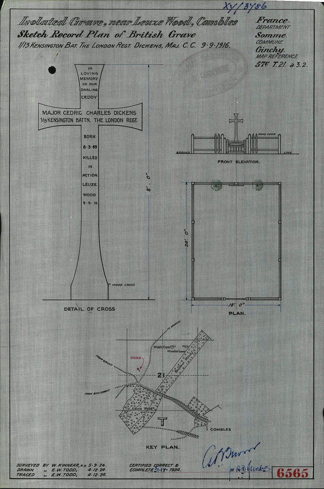Marie Dickens was determined that her son’s body should not be moved, and in February 1919 made a personal visit to the War Office to inform them that she would make arrangements to purchase the site of his grave. She then made several visits to the IWGC to ensure her wishes were understood, meeting Fabian Ware on a number of occasions.