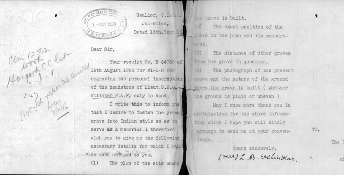 Then in a letter from Mrs Welinkar dated 13 September 1926, she requested that the grave be 'fastened...into the Indian style to serve as a memorial' as well as a number of details about the positioning and location of the grave. The Commission responded it did not understand Mrs Welinkar’s request, but explained that as there was already a Commission headstone over the grave, there could be ‘nothing else of a permanent character to be added to the grave’, in accordance with its policy made in connection with all war graves.