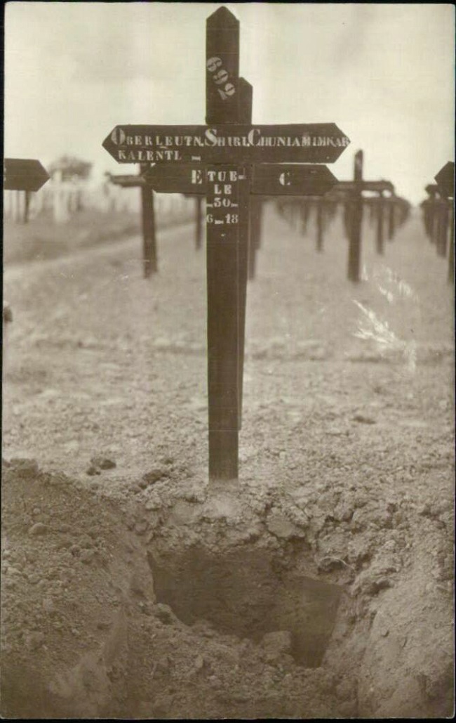 In March 1920, Wing Commander G. Hilton reported he had visited a number of French localities named Rouvroy, but was unsuccessful in locating Welinkar’s grave. Then, in April 1920, a significant lead in the search arrived; a letter was received from a former Royal Engineers officer known as Colonel G.B. Barton who believed Welinkar had been buried by the Germans in a grave at Rouvroy and marked with a German cross under the name of “Oberleutnant S.C. Wumkar”. Barton reported the local French authorities had then reinterred Welinkar’s grave into Maucourt German Cemetery.