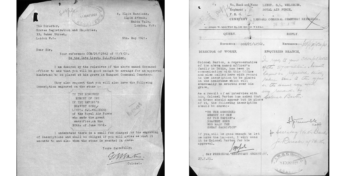 The stories of Lieutenant Welinkar and the other Indian airmen who fought for the British Empire may reflect a relatively small part of India’s role in the First World War, however, the part of Welinkar’s story recorded in the Commission’s Archive shows that his grave was of equal importance to all of the war dead commemorated by the Commission and was to be treated in a manner that, in the words chosen by his family for his personal inscription, respected the memory of ‘one of the Empire’s bravest sons’.