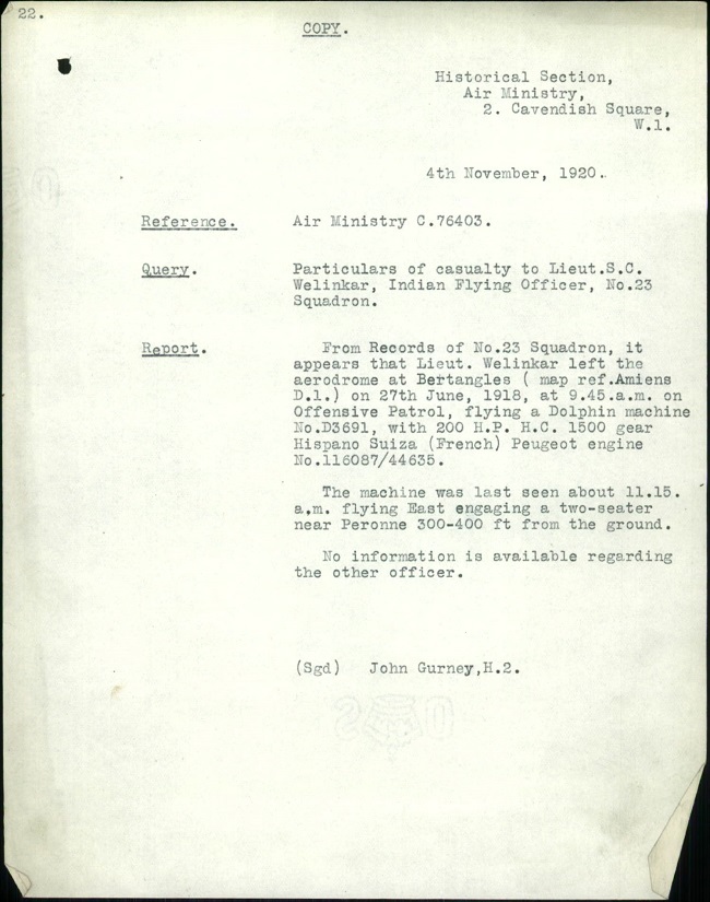 The Indian Ambassador to France His Excellency Sardar Hardit Singh Malik, who is best remembered as the first Indian pilot to be accepted into the RFC and who scored several victories during the war, visited the Arras Flying Services Memorial in 1951 and noticed that the name of his former comrade Lieutenant Welinkar was not present on the memorial. The Commission responded that Welinkar not missing as his grave was known and marked in Hangard Communal Cemetery Extension.