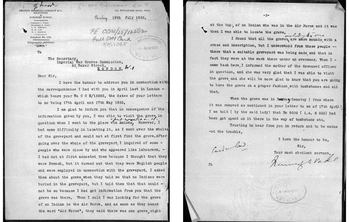 The stories of Lieutenant Welinkar and the other Indian airmen who fought for the British Empire may reflect a relatively small part of India’s role in the First World War, however, the part of Welinkar’s story recorded in the Commission’s Archive shows that his grave was of equal importance to all of the war dead commemorated by the Commission and was to be treated in a manner that, in the words chosen by his family for his personal inscription, respected the memory of ‘one of the Empire’s bravest sons’.