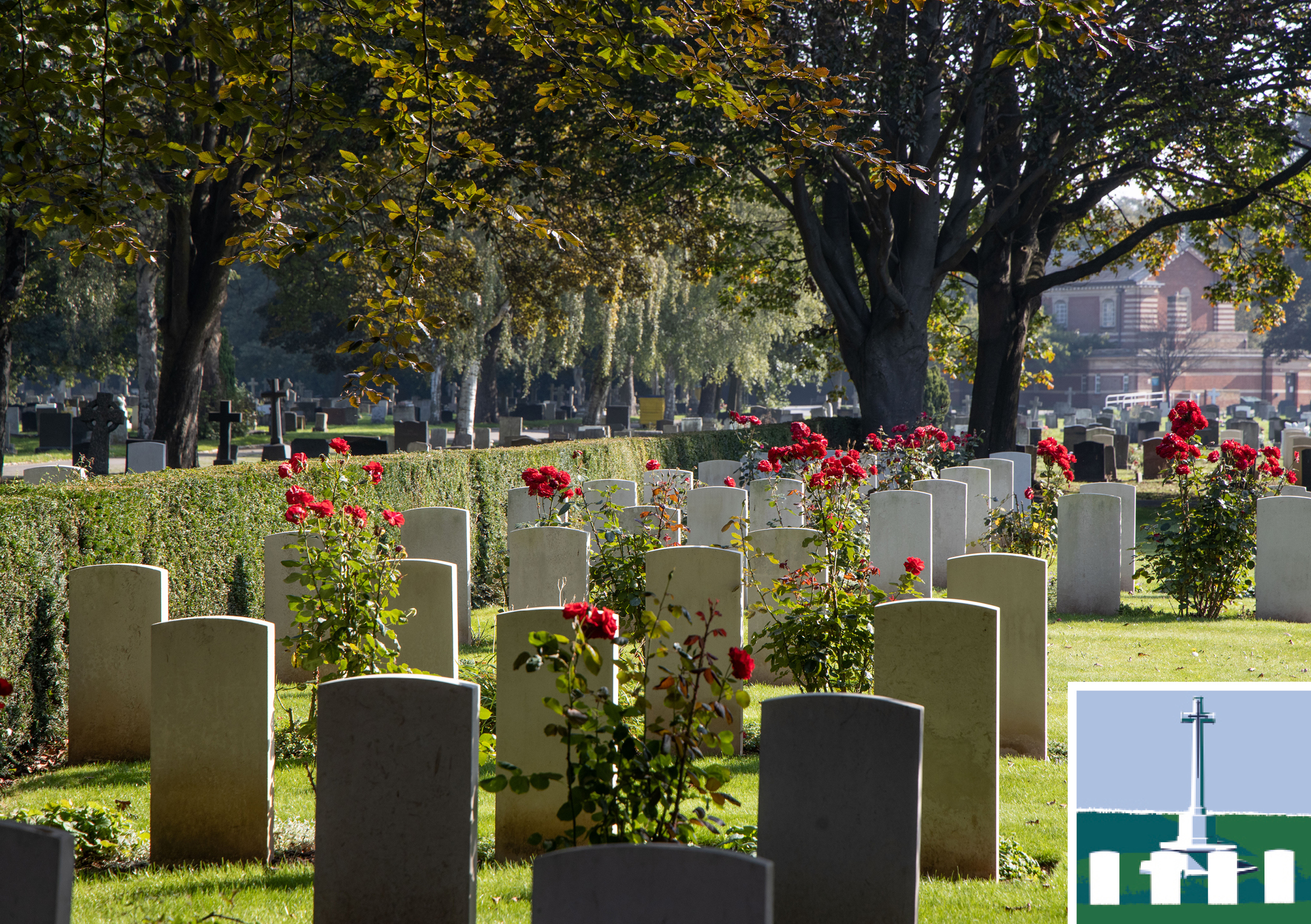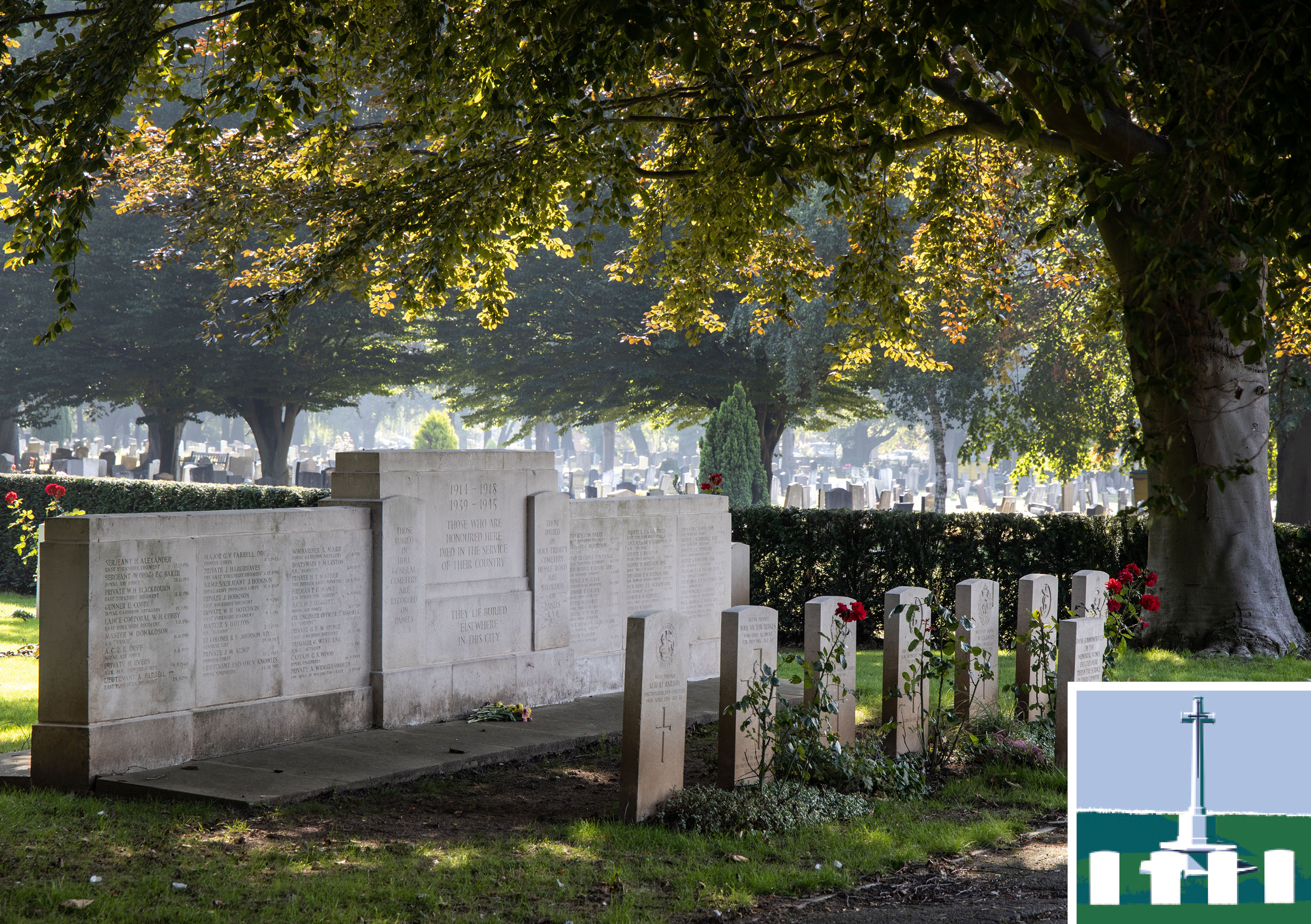 The war plot in the cemetery contains some 55 graves from the Second World War, but the majority are scattered throughout the cemetery. Our screen wall records the names of 56 service people who were cremated at the crematorium next to the cemetery, along with the names of servicemen buried in other cemeteries in the area whose graves cannot be individually marked or maintained. The vast majority of those we commemorate here were members of United Kingdom forces, but there are two of Canadian units, 12 German and one Italian serviceman.