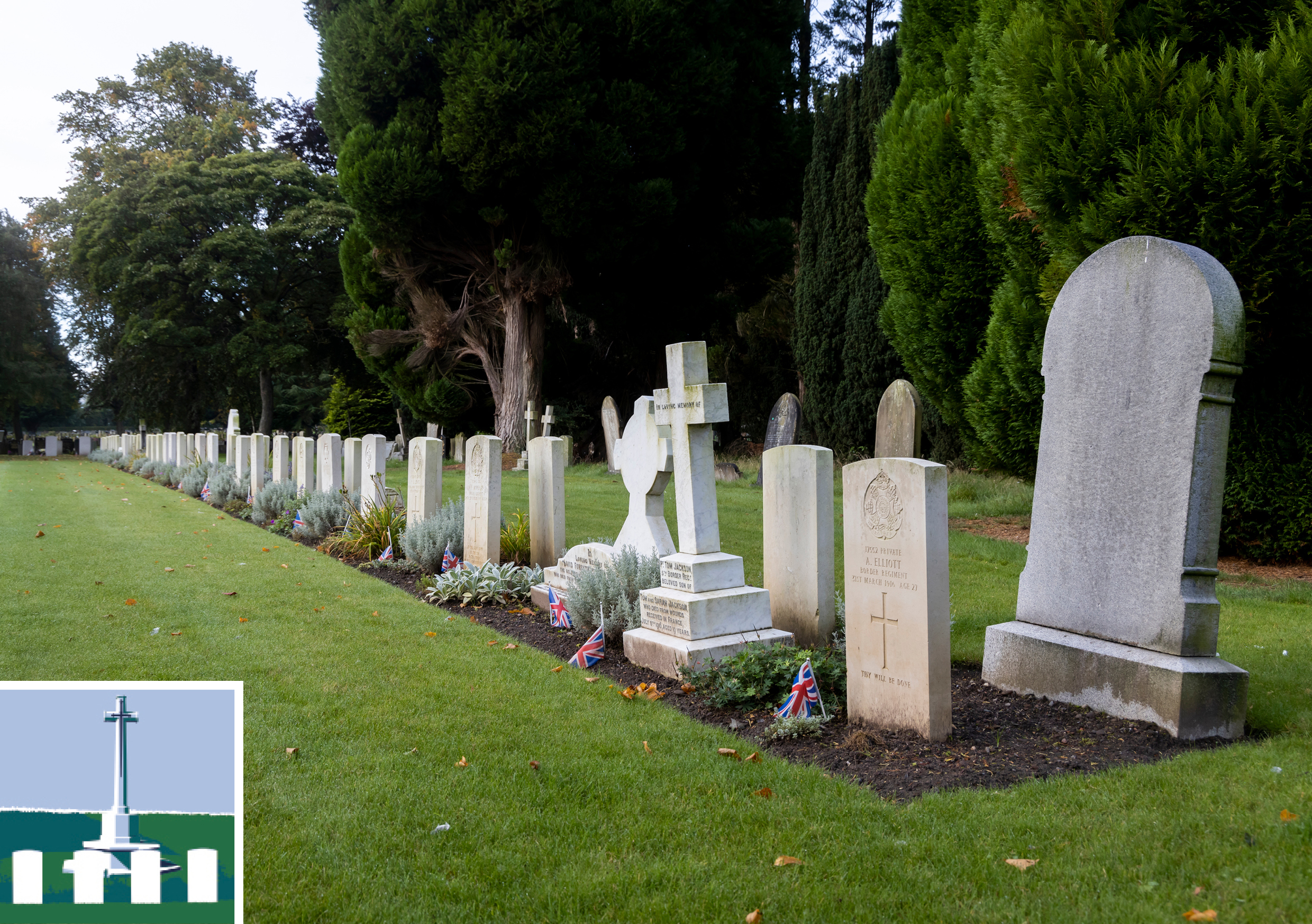 During the First World War, the Fusehill War Hospital was established in the old Poor Law Hospital and some schools in Carlisle. Of the 134 Commonwealth burials of the First World War, 79 are in a plot on the eastern side of Ward XI and the remainder scattered in other parts of the cemetery. There are 128 Commonwealth graves of the Second World War, around half of which are situated in the War Graves Plot, which adjoins the 1914-1918 War Plot. Many of the Second World War airmen buried here belonged to the Royal Air Force Operational Training Unit at Crosby-on-Eden. The Cross of Sacrifice stands near the junction of the 1914-1918 and 1939-1945 War Plots, serving as a central memorial for the graves of both wars. In this cemetery we care for the graves of members of Australian, Canadian, New Zealand and United Kingdom forces, along with Polish, German and Italian soldiers and airmen.