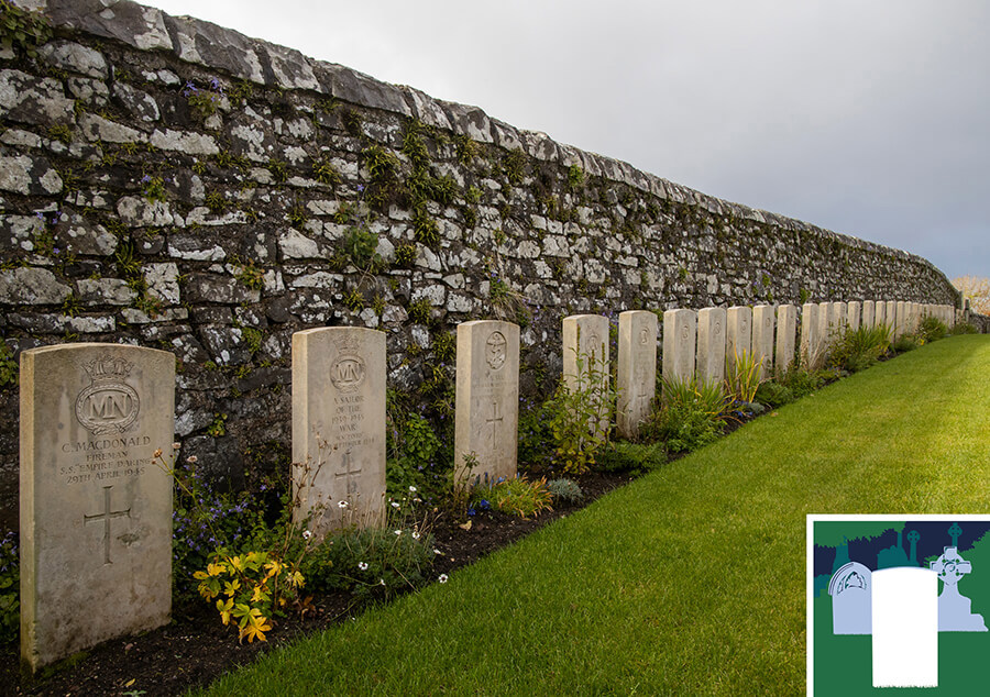 This isolated cemetery was begun following the sinking of the troop ship HMS Otranto off Islay in October 1918 and is the final resting place of 74 British servicemen, 71 being crewmen of the Otranto.