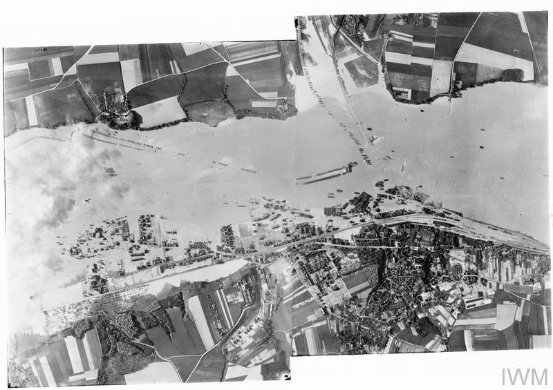 A (vertical) reconnaissance photo of the Ruhr Valley at Froendenberg-Boesperde, some 13 miles south from the Moehne Dam, showing massive flooding. © IWM (CH 9720)