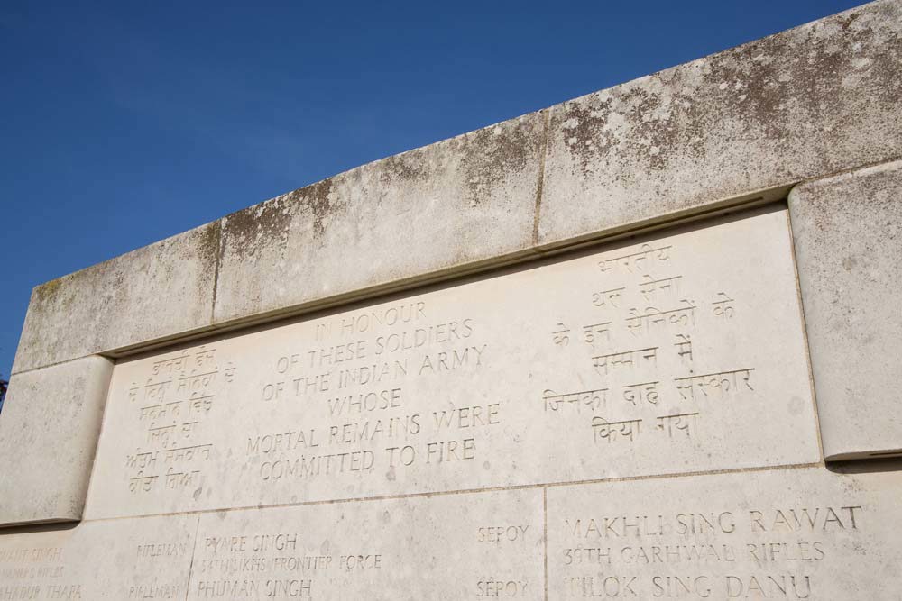 The Patcham Down Indian Forces Cremation Memorial commemorates 53 men of Indian Army who died and were cremated at Patcham Down ghat during the First World War in accordance with Hindu and Sikh religious rites. These soldiers had all been transferred to hospital in Brighton after fighting on the Western Front in 1914/15. The graves of Muslim soldiers who died in Brighton are in Brookwood Military Cemetery, Surrey. The inscription on the memorial, which is written in Hindi, Punjabi and English, reads: "IN HONOUR OF THESE SOLDIERS OF THE INDIAN ARMY WHOSE MORTAL REMAINS WERE COMMITTED TO FIRE" The majority were originally commemorated on the Neuve-Chapelle Memorial in France, which is the memorial for 4,700 soldiers of the Indian Army who died on the Western Front and who have no known grave.