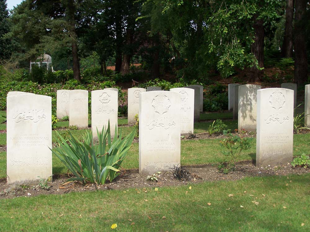 At Brookwood in Surrey, there are more than 50 war graves to soldiers who came from India, Pakistan, and Nepal. 30 of those are in Brookwood Cemetery, where they are buried in the Muslim plot in the North-West corner – the first Muslim Cemetery in Britain. Many of the burials date from the First World War. The first soldier to be buried in this plot was Sepoy Ahmad Kahn of the 3rd Sapper and Miners. He was the son of Sajawulmulk of Thutha-Rai-Bahadur, Kharian, Gujrat, Punjab. He had died of wounds on a hospital ship on the way from France to the hospital at Netley.