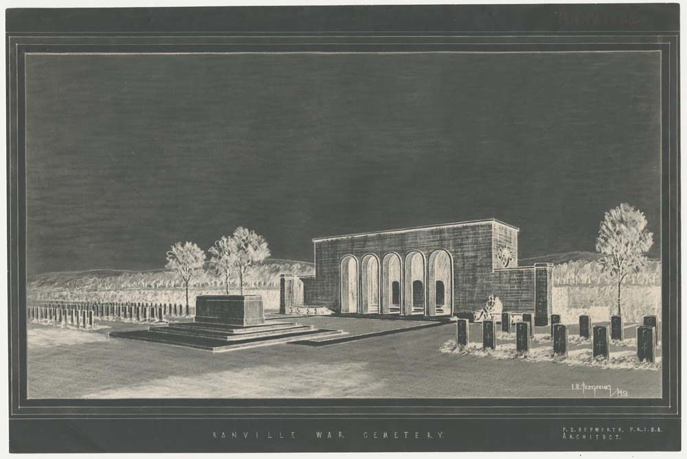 As you approach the cemetery, you’ll notice how designer Phillip Hepworth, delicately framed Ranville’s Cross of Sacrifice through the entryway’s elegant arch. Step in and row upon row of CWGC headstones await, each marking the grave of a WW2 soldier.