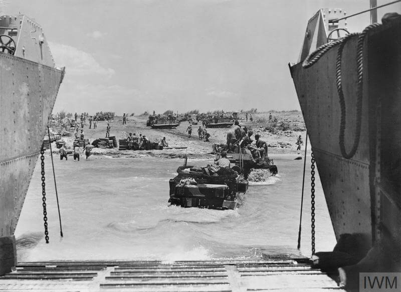 An armoured vehicle was being towed ashore from landing craft during the landings in Sicily at dawn of the opening day of the invasion. IWM (A 17918)