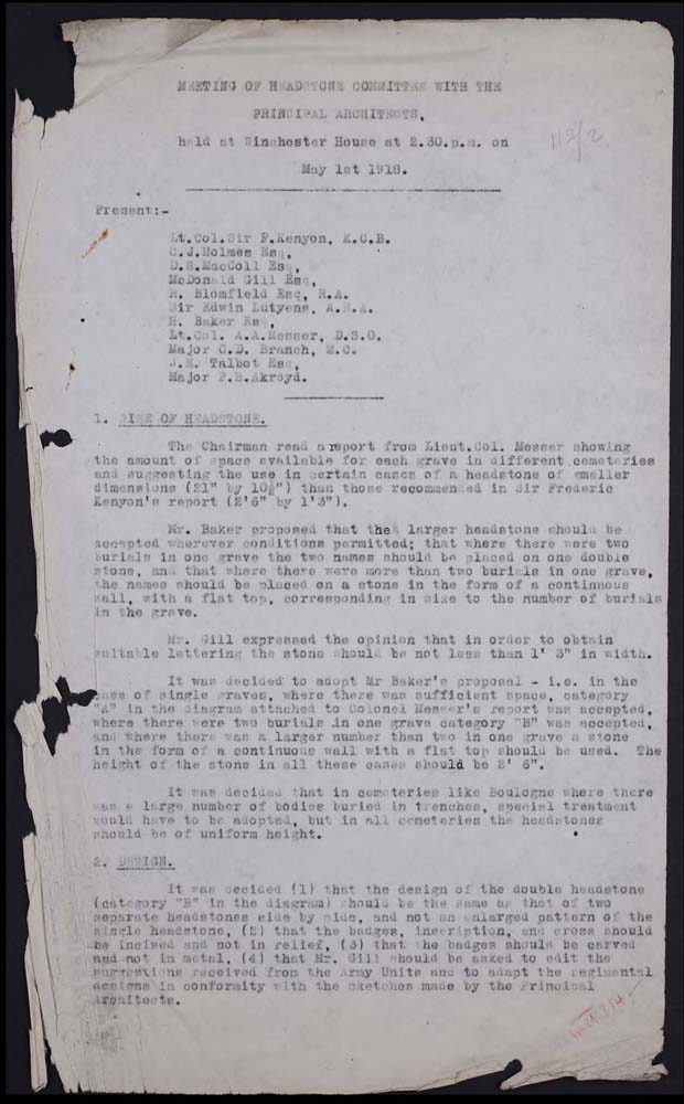 Meeting minutes from 1 May 1918 show the Headstone Committee and Principal Architects were still very much debating how Commission headstones would look. Talking points were: