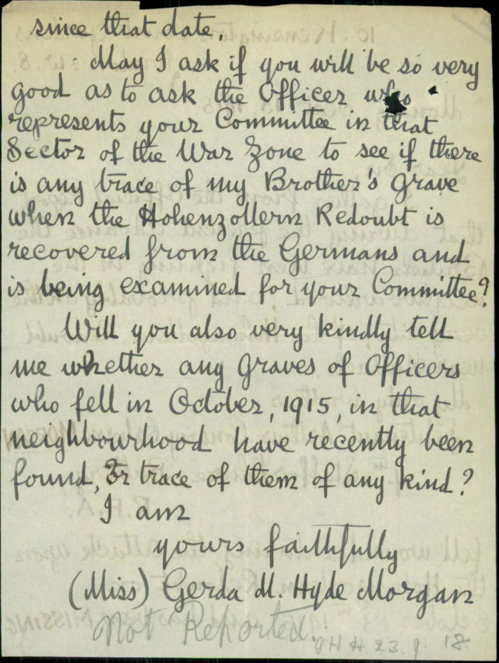 Arthur’s sister, G. H.H. Morgan, wrote to the Commission in September 1918 enquiring as to her brother’s whereabouts in the Hohenzollern Redoubt near Loos-en-Gohelle, northern France. The Hohenzollern Redoubt was a German Army strongpoint, captured in October 1915 before being retaken later on in the war following an Allied advance.