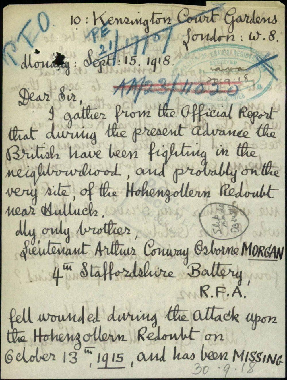 Many of these often-heartbreaking messages were from people wishing to discover the location of their loved ones’ war graves, such as the letter below from the sister of Lieutenant Arthur Conway Osbourne Morgan.