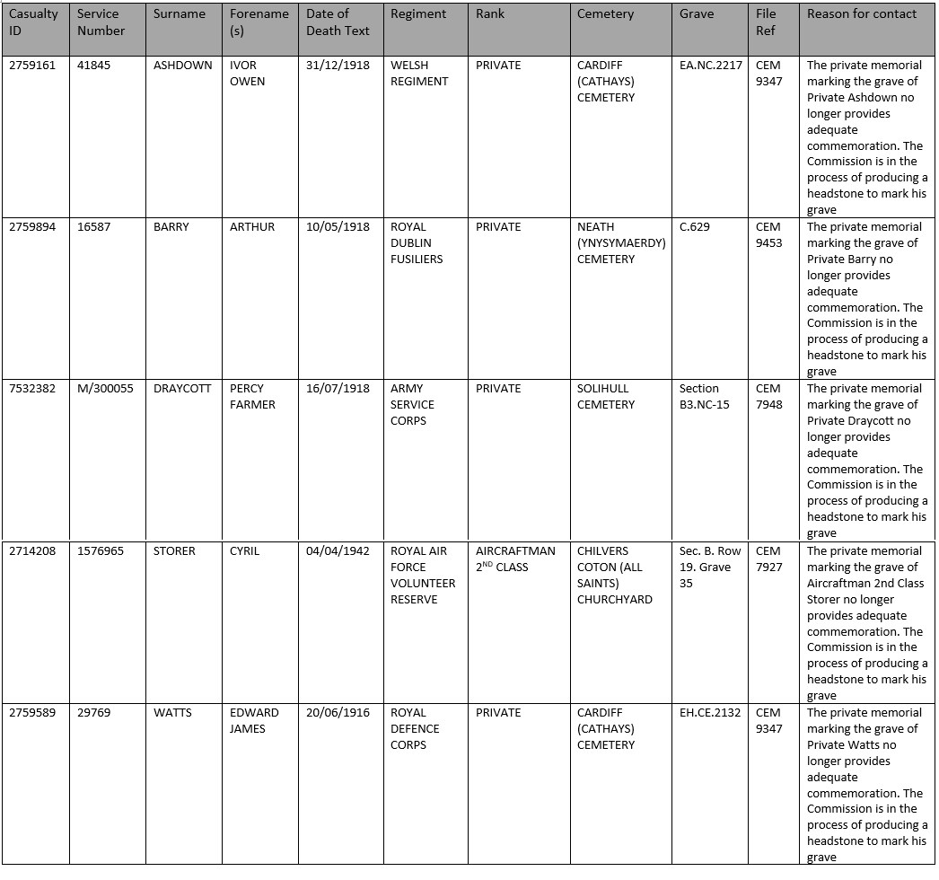 We wish to make contact with any family members of the casualties concerned in the document attached.