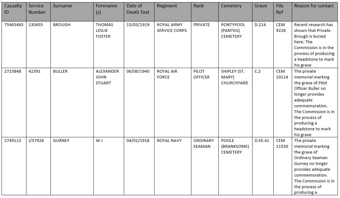 We wish to make contact with any family members of the casualties concerned in the document attached.