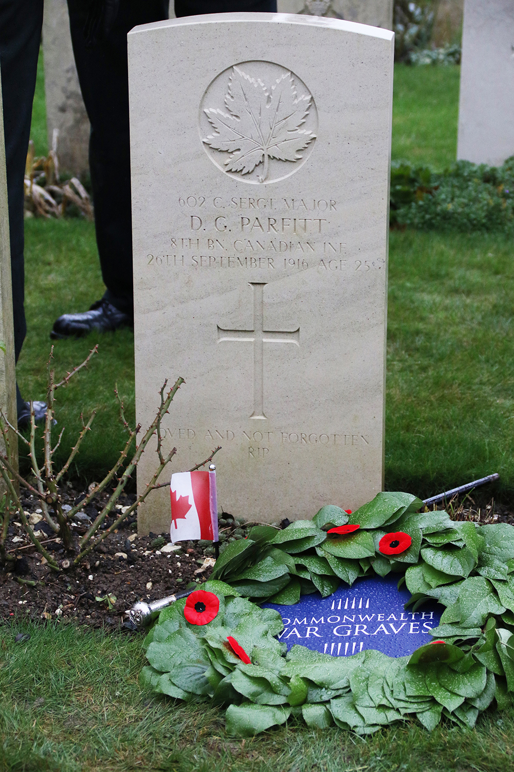 A rededication service for Company Sergeant-Major David George Parfitt was held at Regina Trench Cemetery, Grandcourt, France, in November 2023.