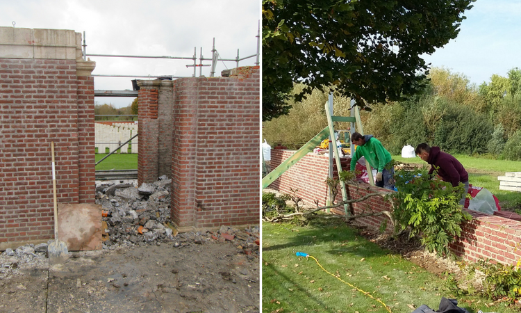 The restoration works at Artillery Wood Cemetery include the dismantling and reconstruction of the entrance building, tool shed and cemetery walls. To ensure the sustainability of the project, every element is carefully taken apart and if possible repaired and re-used. To this day, bricks are made by hand, baked in traditional ovens and chosen to ensure that the cemetery walls have the same color palette as a century ago.