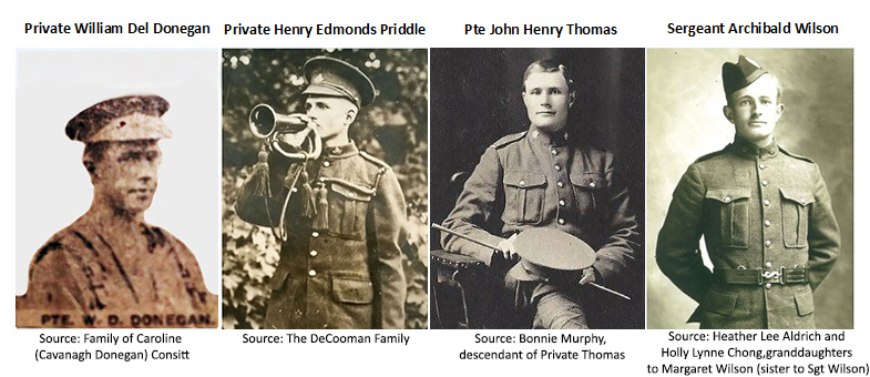 Private William Del Donegan, Private Henry Priddle, and Sergeant Archibald Wilson were also killed during the Battle of Hill 70, while serving with the 16th Battalion, Canadian Expeditionary Force. Their remains were recovered near the village of Vendin-le-Vieil, France.