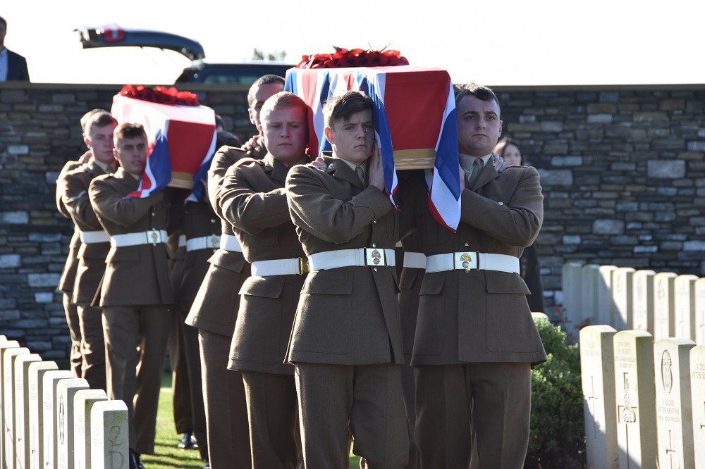 The casualties were interred in three coffins, with three CWGC headstones marking their collective final resting places. Two coffins each contained one unknown soldier with a third containing the partial remains of 11 unknown individuals. In keeping with burial tradition, the casualties were interred together, ensuring that those who served and died together, are buried and commemorated together.