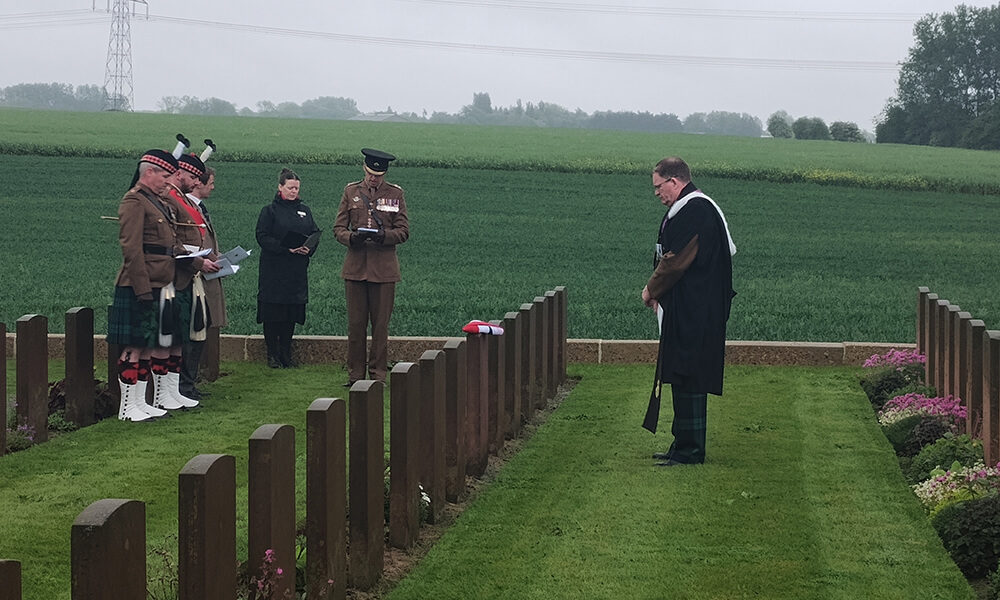 The rededication service, organised by the MOD’s Joint Casualty and Compassionate Centre (JCCC), also known as the ‘MOD War Detectives’, was held at our Courcelles-au-Bois Communal Cemetery Extension on 15 May.